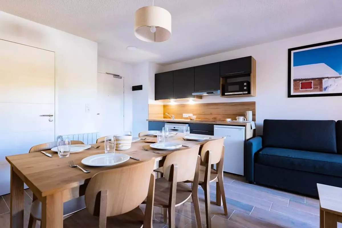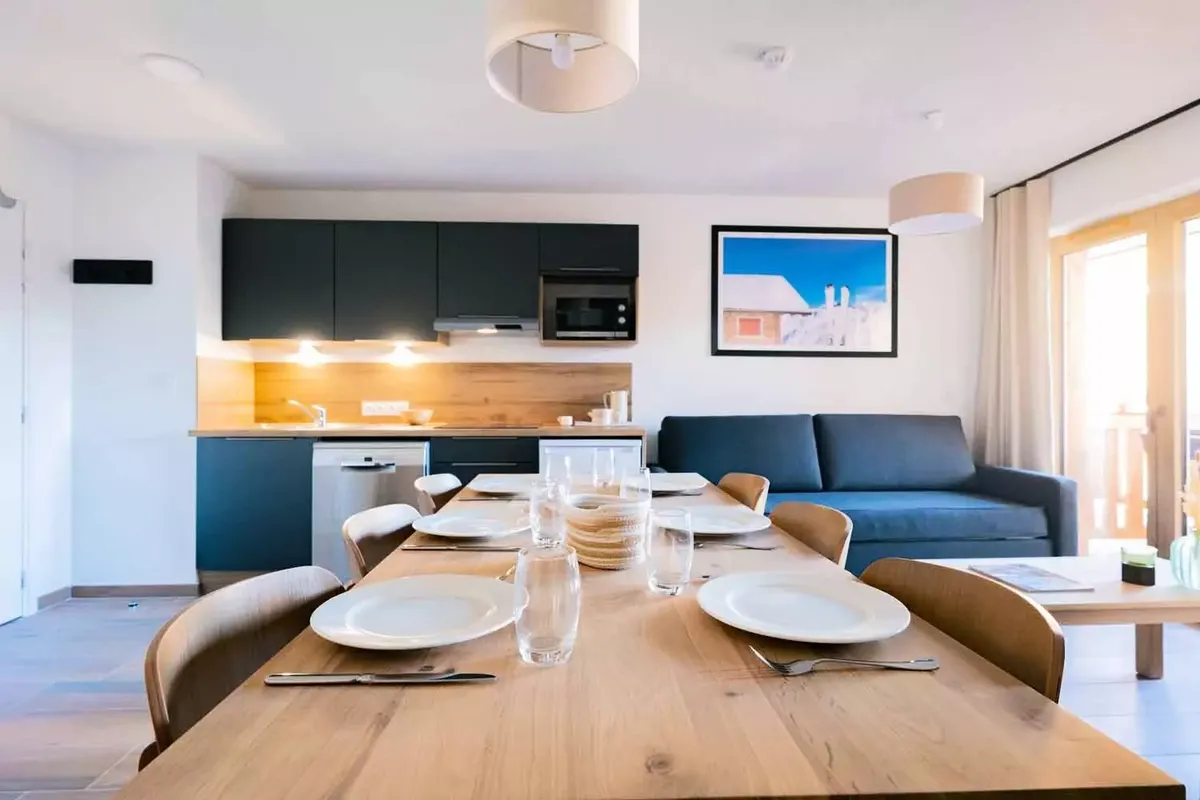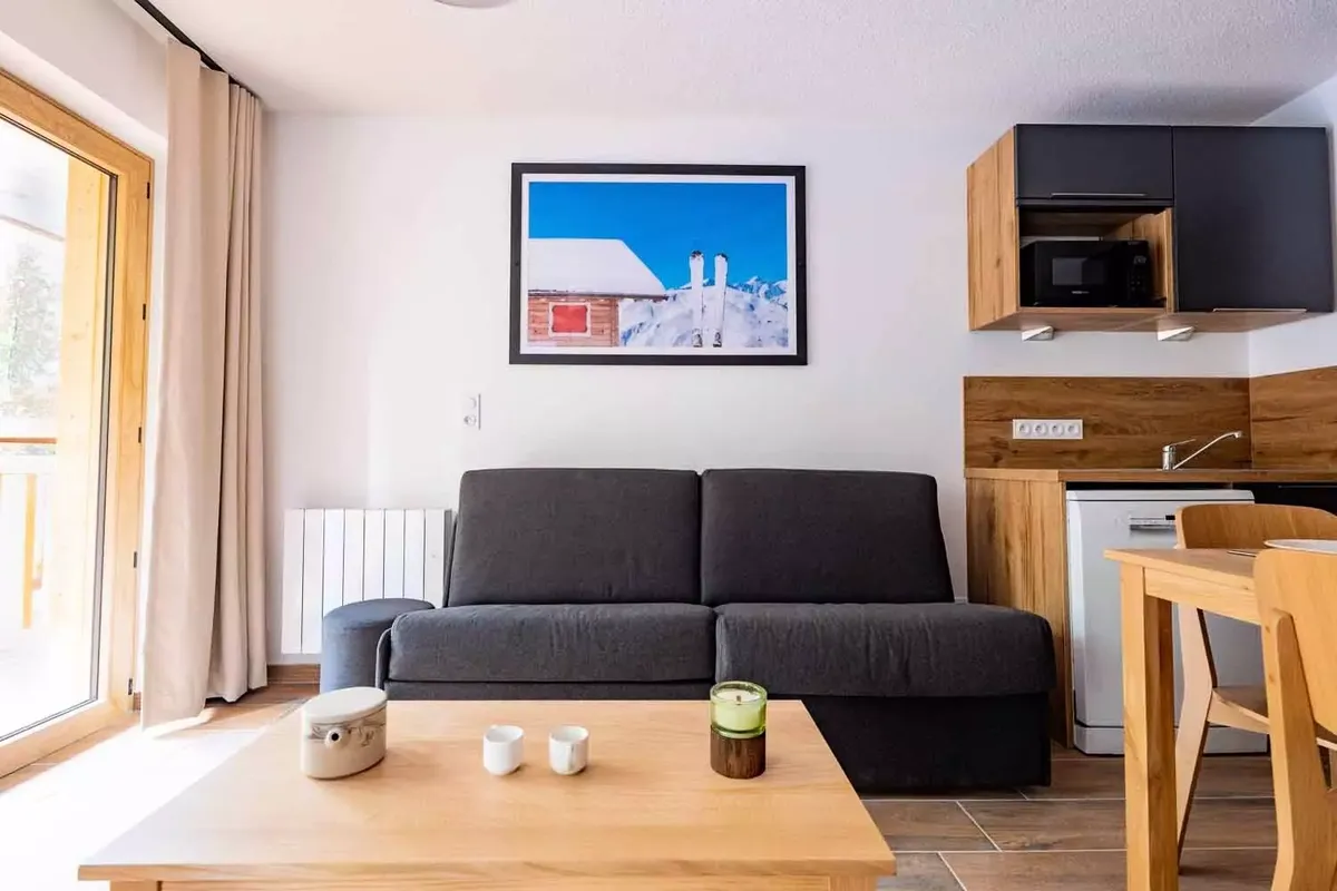 Établissement et services La Résidence Arya-Living-Stone est une construction récente, pensée pour accueillir les vacanciers dans un confort moderne. Les appartements, allant du studio au T3, sont meublés avec soin et disposent tous d'un balcon avec vue sur les montagnes environnantes. Les intérieurs sont fonctionnels : kitchenette équipée avec plaques vitrocéramiques, micro-ondes, réfrigérateur et lave-vaisselle selon les configurations, séjour avec canapé convertible, chambres séparées et salle de bains moderne. Les WC sont souvent indépendants de la salle d'eau. Chaque logement est également pourvu d'un casier à skis individuel, très pratique pour stocker le matériel après une journée sur les pistes. Le style architectural, associant bois et pierre, s'intègre parfaitement à l'environnement montagnard. À quelques minutes à pied, on retrouve de nombreux commerces et services : supérettes, boulangeries, magasins de sport, restaurants traditionnels et bars à l'ambiance conviviale, ce qui permet de profiter de la vie station au quotidien.