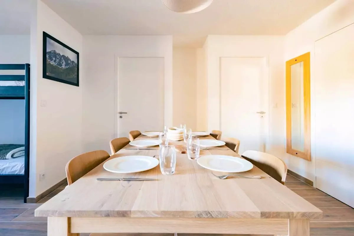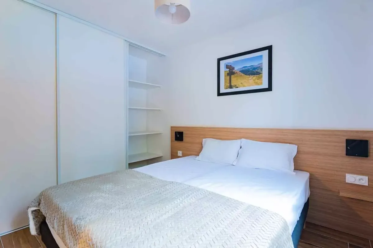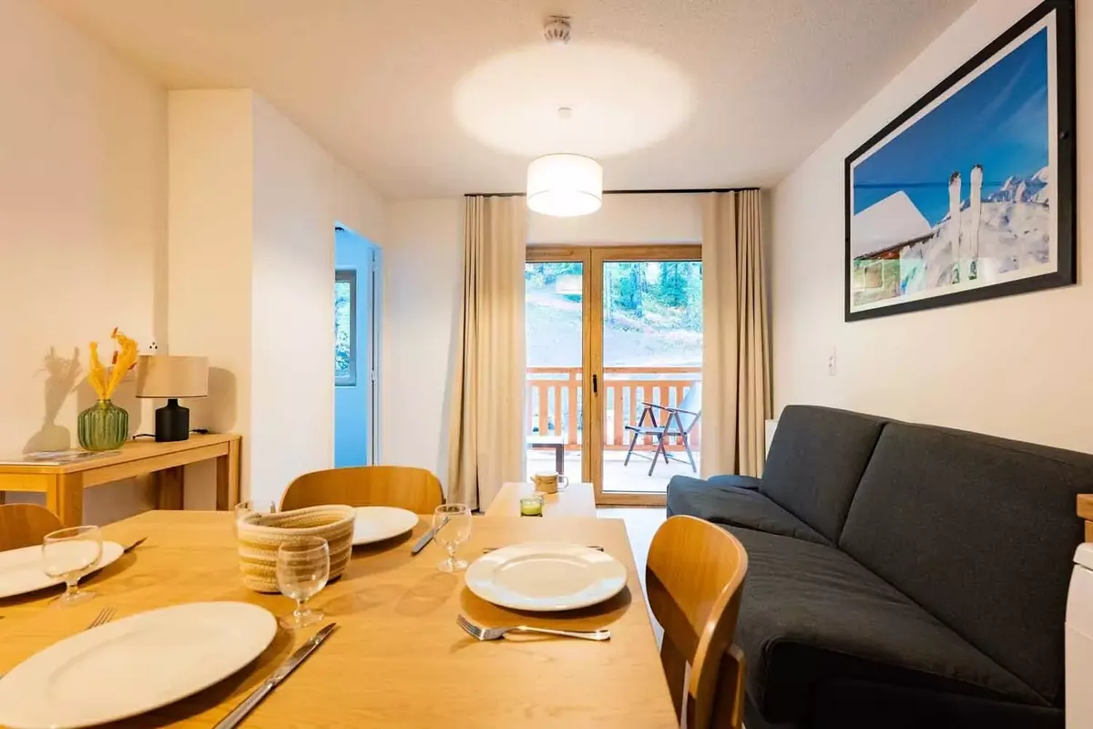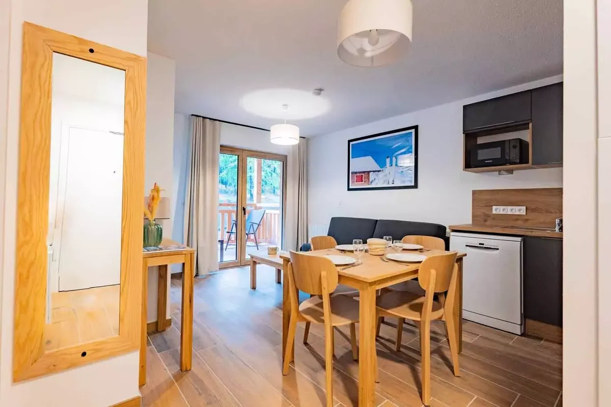 Établissement et services La Résidence Arya-Living-Stone est une construction récente, pensée pour accueillir les vacanciers dans un confort moderne. Les appartements, allant du studio au T3, sont meublés avec soin et disposent tous d'un balcon avec vue sur les montagnes environnantes. Les intérieurs sont fonctionnels : kitchenette équipée avec plaques vitrocéramiques, micro-ondes, réfrigérateur et lave-vaisselle selon les configurations, séjour avec canapé convertible, chambres séparées et salle de bains moderne. Les WC sont souvent indépendants de la salle d'eau. Chaque logement est également pourvu d'un casier à skis individuel, très pratique pour stocker le matériel après une journée sur les pistes. Le style architectural, associant bois et pierre, s'intègre parfaitement à l'environnement montagnard. À quelques minutes à pied, on retrouve de nombreux commerces et services : supérettes, boulangeries, magasins de sport, restaurants traditionnels et bars à l'ambiance conviviale, ce qui permet de profiter de la vie station au quotidien.